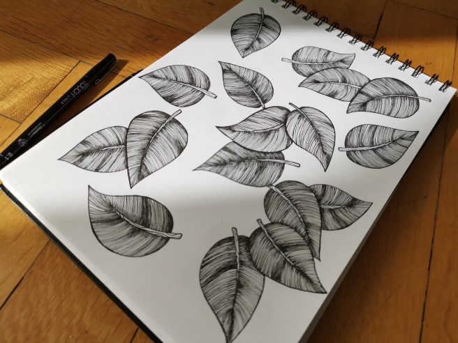 Ich habe Zeichnungen dieser Art öfters bei Instagram gesehn und wollte es auch mal probieren. Das zu zeichnen hat ganz schön lange gedauert, aber Spaß gemacht. Werde sowas in der Art nochmal probieren, aber die Blätter dann in eine Form legen oder so.